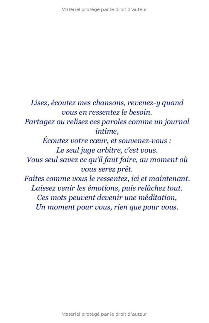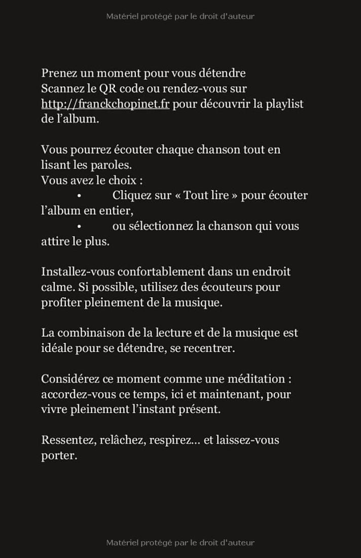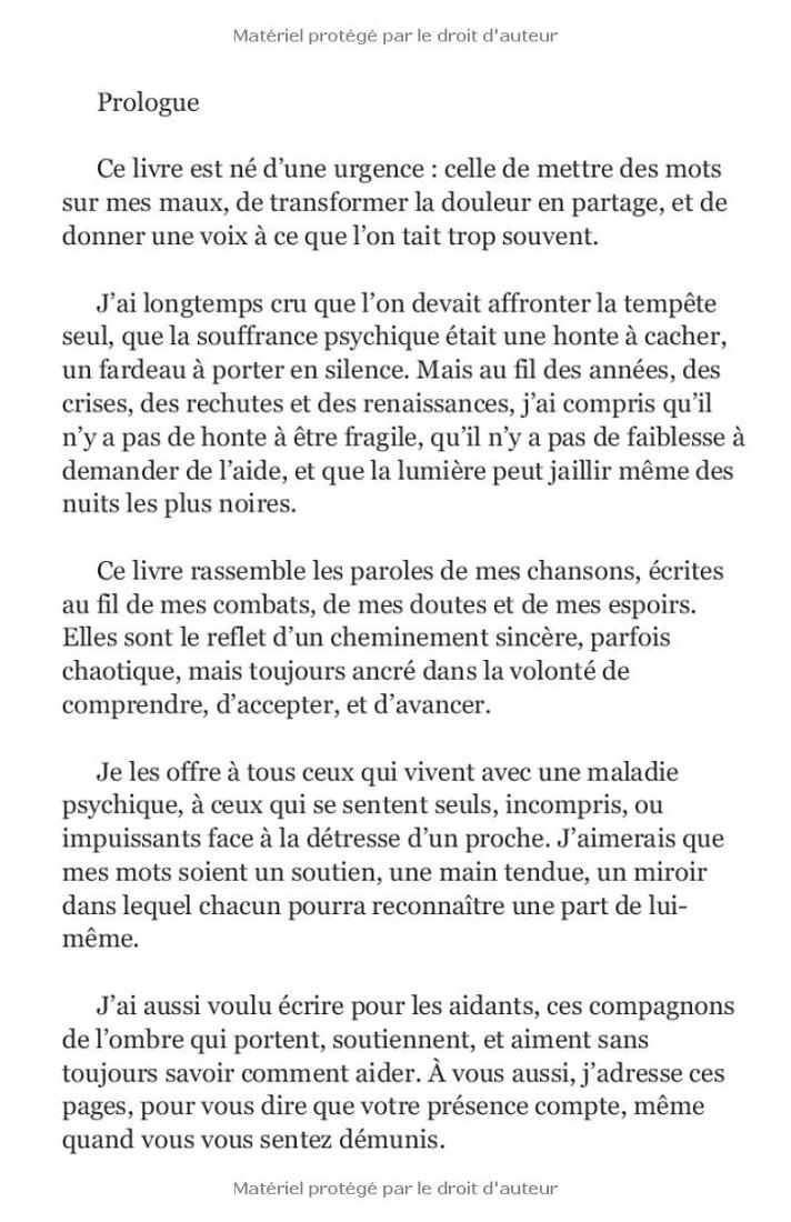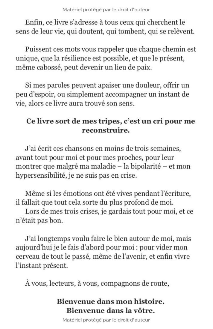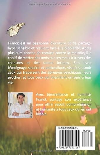 Ce livre est un témoignage intime, sans masque, sur la vie avec la bipolarité et l’hypersensibilité. À travers les paroles de 37 chansons écrites pour guérir ses propres blessures, Franck partage son cheminement entre crises, doutes, rechutes et renaissances. Chaque chanson, accessible via un lien vers sa version chantée, prolonge ce récit authentique et vibrant.